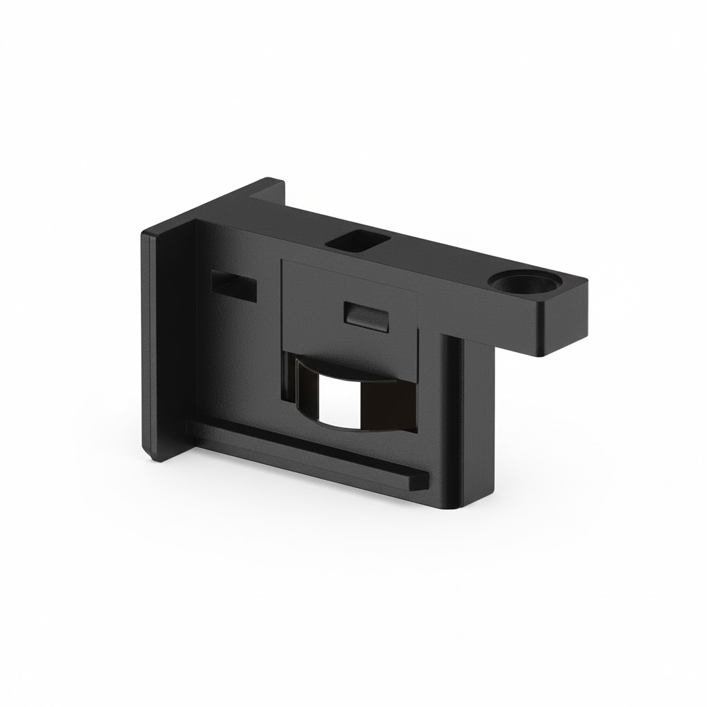 Это монтажный элемент, предназначенный для подключения трековых светильников к шинопроводу (трековой системе). Выполнен в чёрном цвете, имеет компактную угловую конструкцию с крепёжными отверстиями и фиксирующим механизмом.