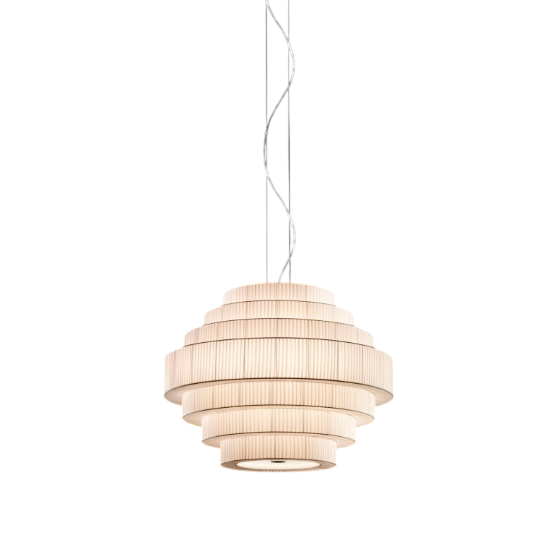 Люстра MOZ-ONE by Romatti — изысканное сочетание современного дизайна и утончённой эстетики. Её отличительная черта — многоуровневый абажур, выполненный из мягкой ткани светлого оттенка. Волнообразная структура ярусов создаёт эффект лёгкости и воздушности, превращая люстру не просто в источник света, а в выразительный декоративный элемент интерьера.