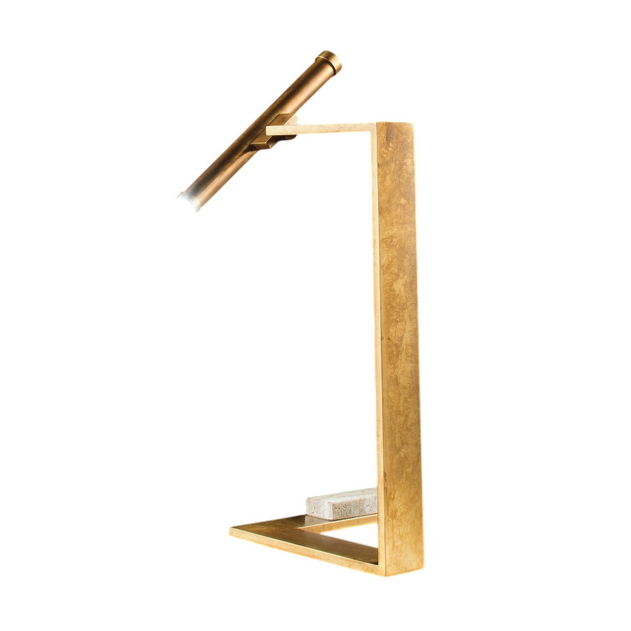 Настольная лампа PLAT by Romatti — выразительный образец современного минимализма, выполненный из металла с изысканной золотистой отделкой. Её лаконичная конструкция сочетает строгие геометрические линии: вертикальная стойка в форме буквы «П» поддерживает наклонный световой модуль, создавая одновременно функциональную и художественную композицию.