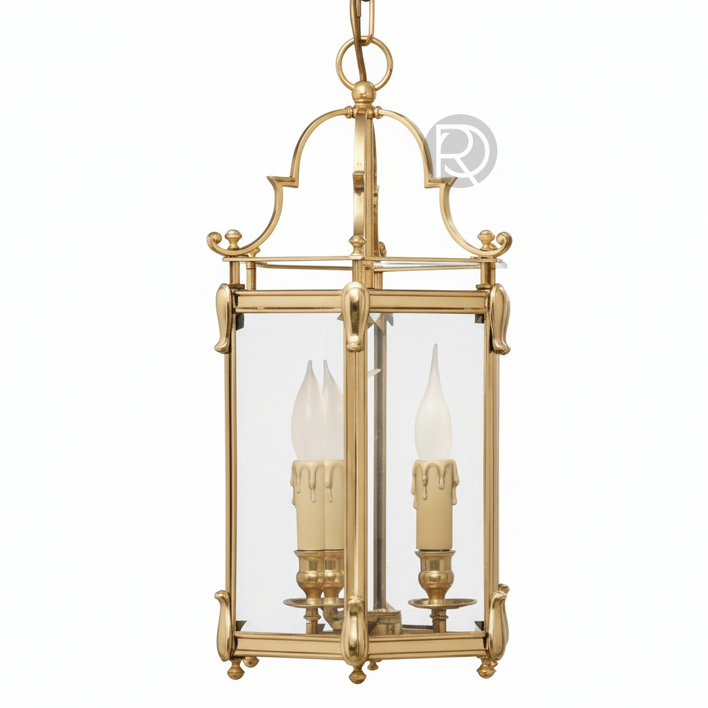 Светильник имеет классическую прямоугольную форму подвесного фонаря. Четкие линии и декоративные "коронованные" изгибы верхней части рамы придают ему аристократичности.