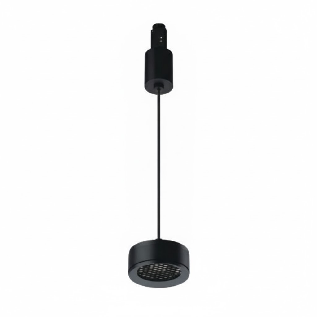 Конструкция светильника выполнена в виде компактного цилиндрического корпуса с перфорированной нижней частью, обеспечивающей равномерное рассеивание света. Крепление на трековую систему делает его максимально удобным в использовании — положение светильника легко регулируется, позволяя акцентировать свет на нужных зонах. Тонкий подвес придаёт изделию лёгкость и визуально не перегружает пространство.